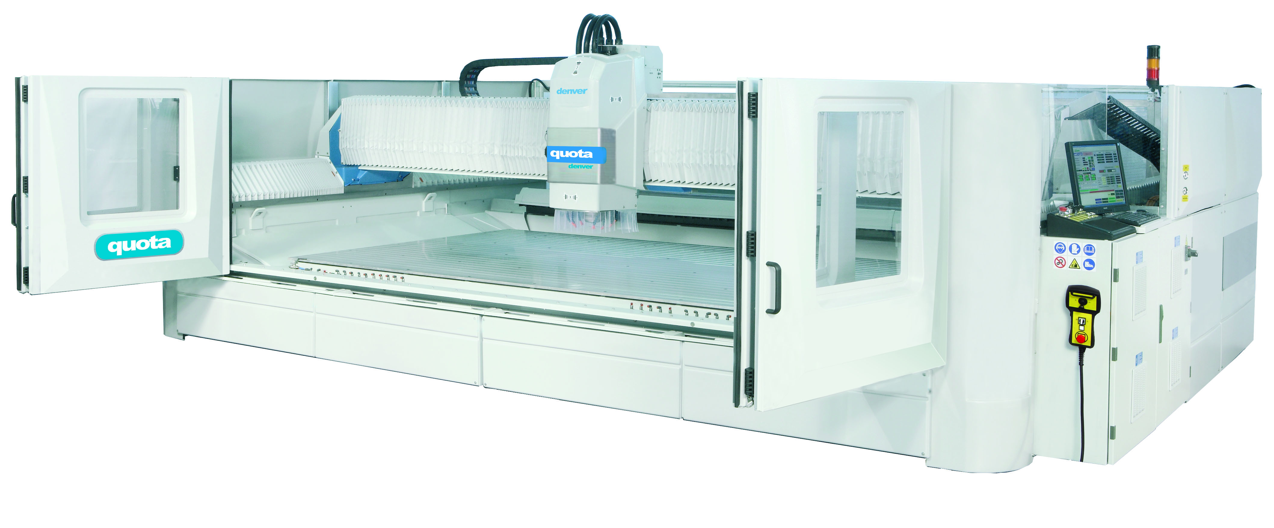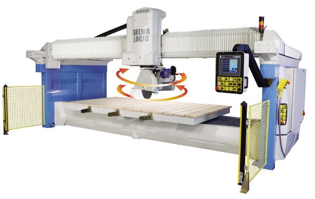 Fresa a ponte monoblocco a 4 assi motorizzati con testa girevole automaticamente a 180°, e 5° asse manuale per inclinazione del disco.